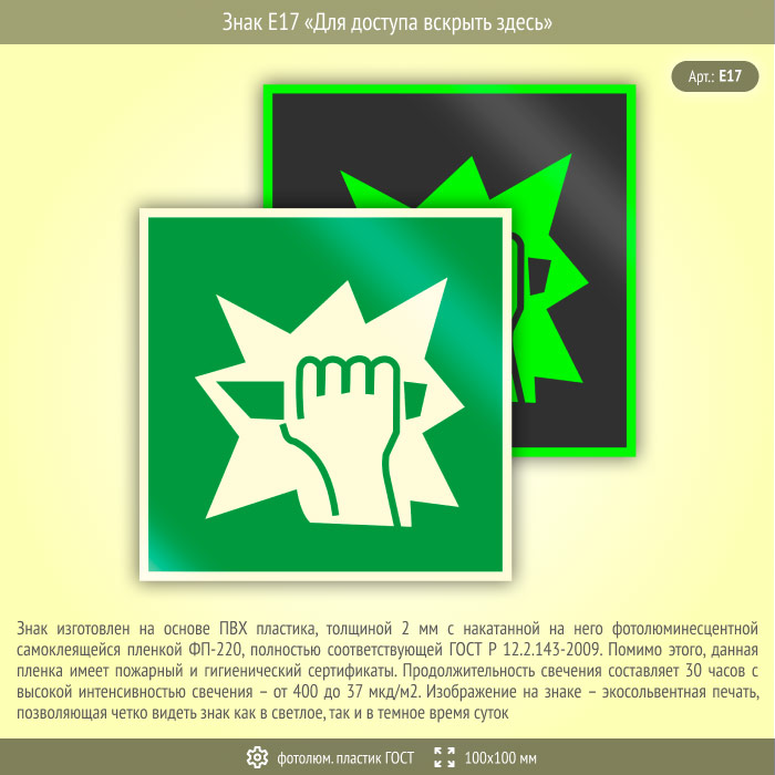 Знак E17 «Для доступа вскрыть здесь» (фотолюминесцентный пластик ГОСТ 34428-2018, 100х100 мм) в Альметьевске купить