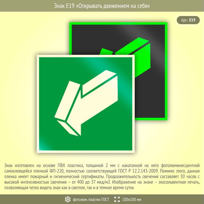 Знак E19 «Открывать движением на себя» (фотолюминесцентный пластик ГОСТ 34428-2018, 100х100 мм) в Альметьевске купить
