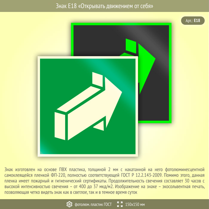 Знак E18 «Открывать движением от себя» (фотолюминесцентный пластик ГОСТ 34428-2018, 150х150 мм) в Альметьевске купить