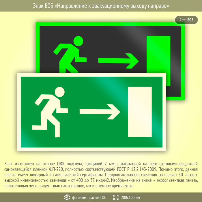 Знак E03 «Направление к эвакуационному выходу направо» (фотолюминесцентный пластик ГОСТ 34428-2018, 200х100 мм) в Альметьевске купить