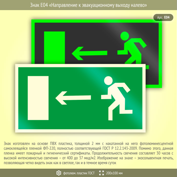Знак E04 «Направление к эвакуационному выходу налево» (фотолюминесцентный пластик ГОСТ 34428-2018, 200х100 мм) в Альметьевске купить