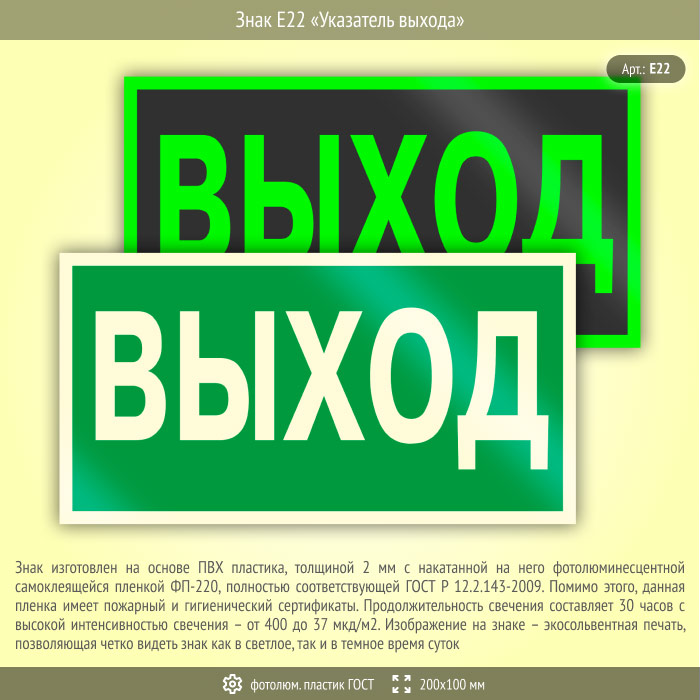 Знак E22 «Указатель выхода» (фотолюминесцентный пластик ГОСТ 34428-2018, 200х100 мм) в Альметьевске купить