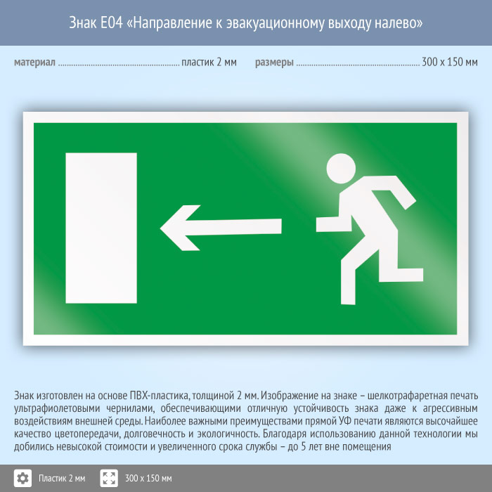 Знак E04 «Направление к эвакуационному выходу налево» (пластик, 300х150 мм) в Альметьевске купить