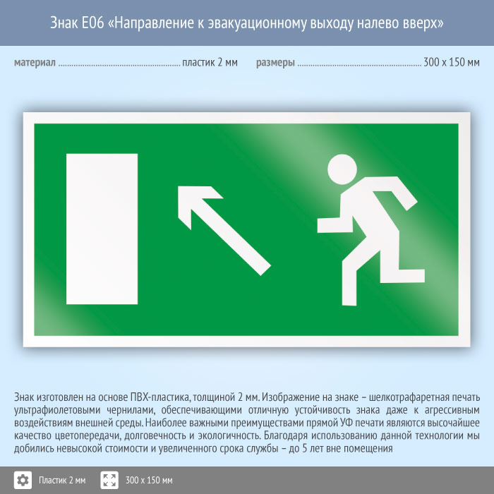 Знак E06 «Направление к эвакуационному выходу налево вверх» (пластик, 300х150 мм) в Альметьевске купить