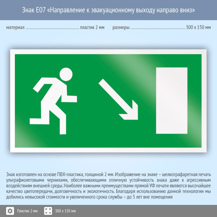 Знак E07 «Направление к эвакуационному выходу направо вниз» (пластик, 300х150 мм) в Альметьевске купить