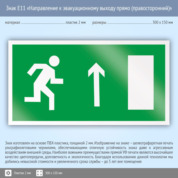Знак E11 «Направление к эвакуационному выходу прямо (правосторонний)» (пластик, 300х150 мм) в Альметьевске купить