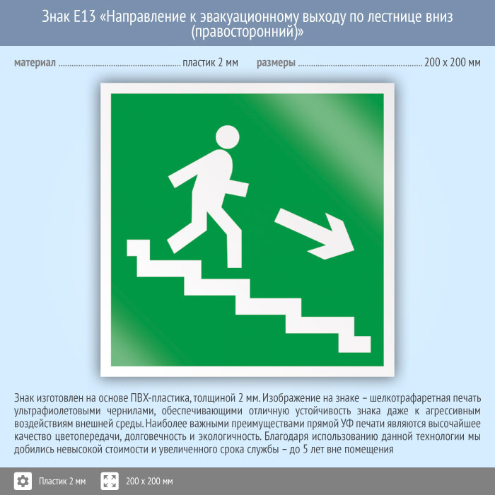 Знак E13 «Направление к эвакуационному выходу по лестнице вниз (правосторонний)» (пластик, 200х200 мм) в Альметьевске купить