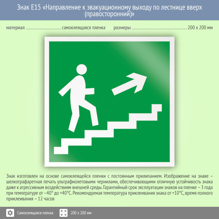 Знак E15 «Направление к эвакуационному выходу по лестнице вверх (правосторонний)» (пленка, 200х200 мм) в Альметьевске купить