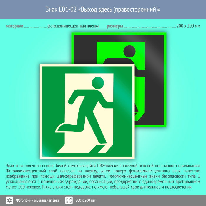 Знак E01-02 «Выход здесь (правосторонний)» (фотолюминесцентная пленка, 200х200 мм) в Альметьевске купить