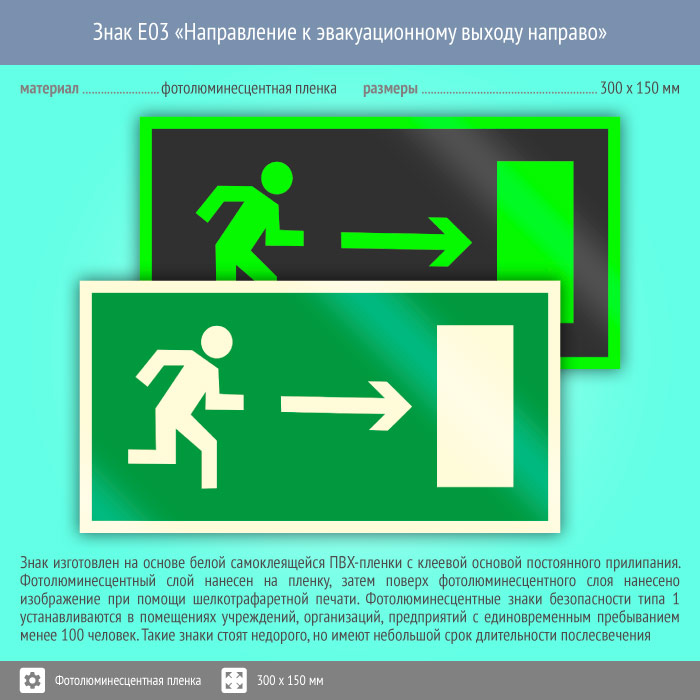 Знак E03 «Направление к эвакуационному выходу направо» (фотолюминесцентная пленка, 300х150 мм) в Альметьевске купить