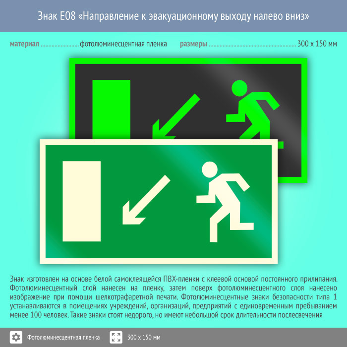 Знак E08 «Направление к эвакуационному выходу налево вниз» (фотолюминесцентная пленка, 300х150 мм) в Альметьевске купить