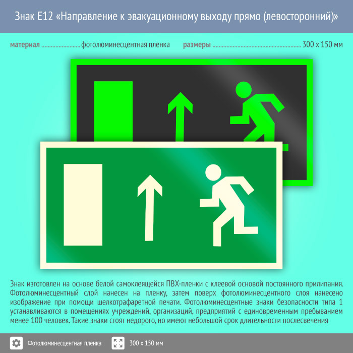 Знак E12 «Направление к эвакуационному выходу прямо (левосторонний)» (фотолюминесцентная пленка, 300х150 мм) в Альметьевске купить