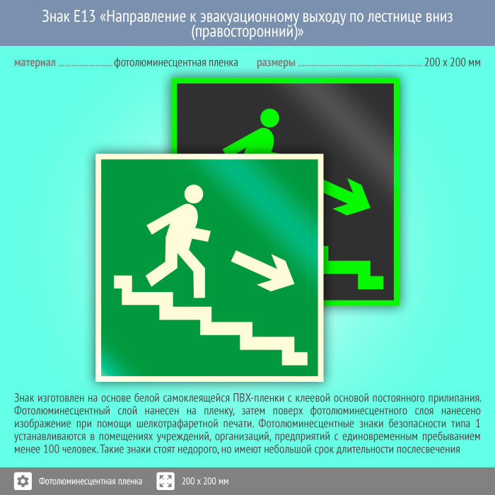 Знак E13 «Направление к эвакуационному выходу по лестнице вниз (правосторонний)» (фотолюминесцентная пленка, 200х200 мм) в Альметьевске купить