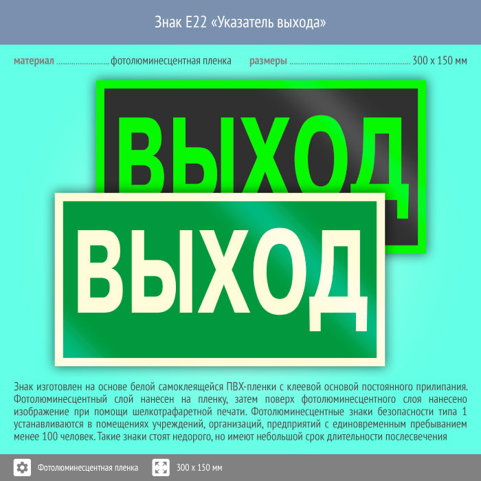 Знак E22 «Указатель выхода» (фотолюминесцентная пленка, 300х150 мм) в Альметьевске купить