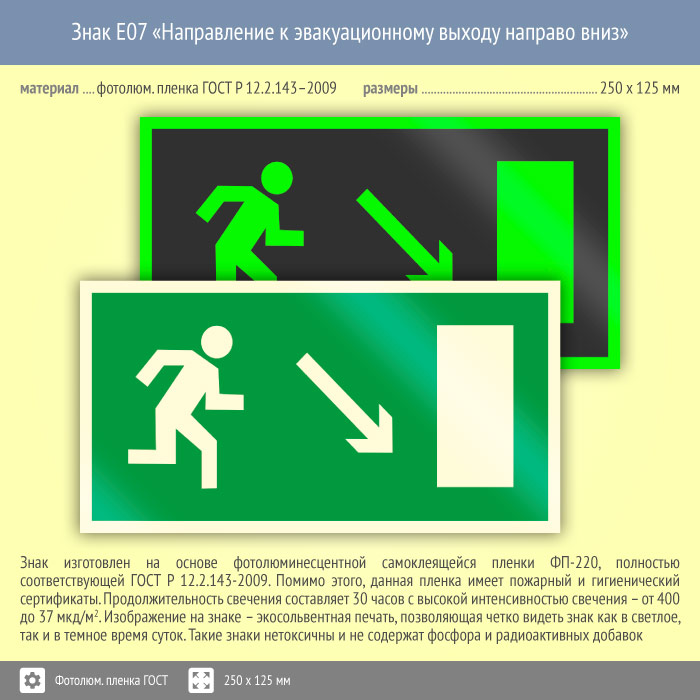 Знак E07 «Направление к эвакуационному выходу направо вниз» (фотолюминесцентная пленка ГОСТ 34428-2018, 250х125 мм) в Альметьевске купить