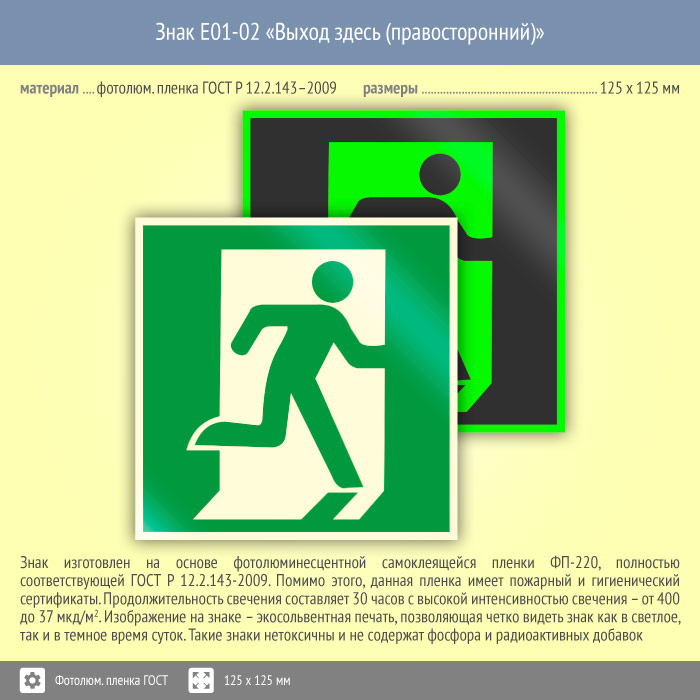 Знак E01-02 «Выход здесь (правосторонний)» (фотолюминесцентная пленка ГОСТ 34428-2018, 125х125 мм) в Альметьевске купить