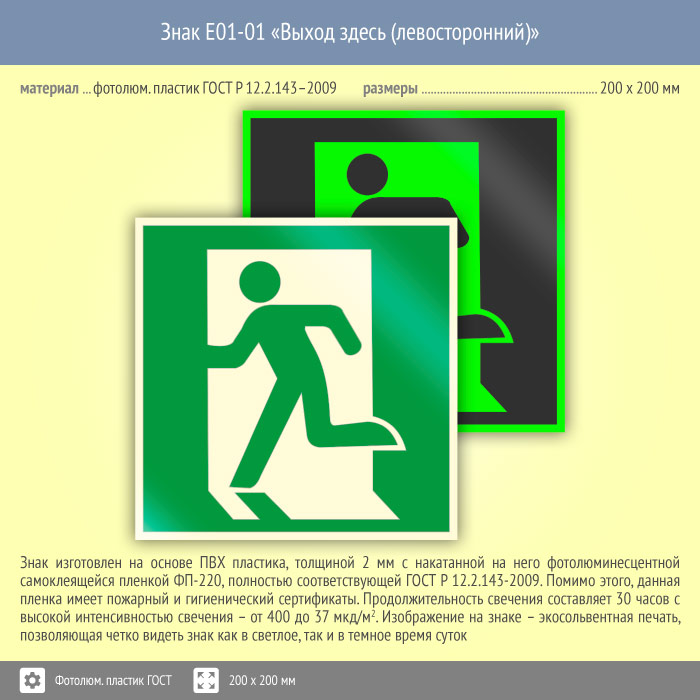 Знак E01-01 «Выход здесь (левосторонний)» (фотолюминесцентный пластик ГОСТ 34428-2018, 200х200 мм) в Альметьевске купить