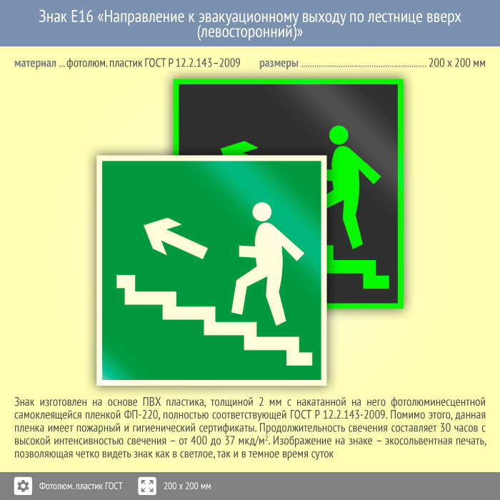 Знак E16 «Направление к эвакуационному выходу по лестнице вверх (левосторонний)» (фотолюминесцентный пластик ГОСТ 34428-2018, 200х200 мм) в Альметьевске купить