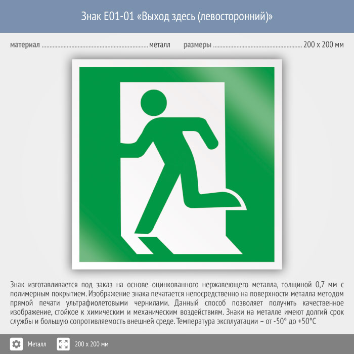 Знак E01-01 «Выход здесь (левосторонний)» (металл, 200х200 мм) в Альметьевске купить
