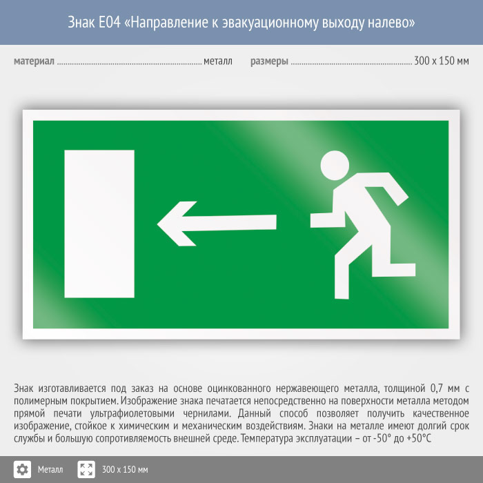 Знак E04 «Направление к эвакуационному выходу налево» (металл, 300х150 мм) в Альметьевске купить