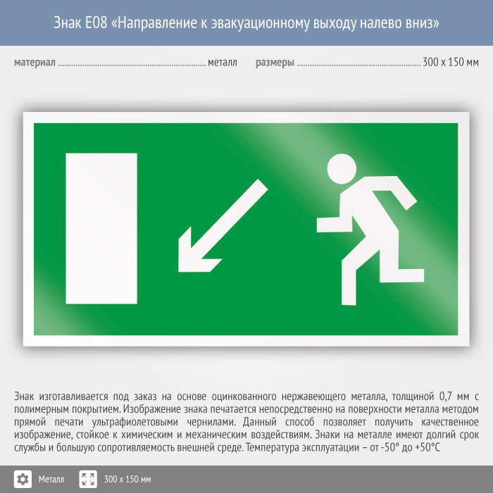Знак E08 «Направление к эвакуационному выходу налево вниз» (металл, 300х150 мм) в Альметьевске купить