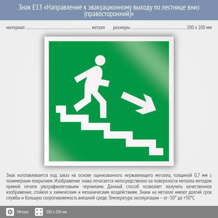 Знак E13 «Направление к эвакуационному выходу по лестнице вниз (правосторонний)» (металл, 200х200 мм) в Альметьевске купить