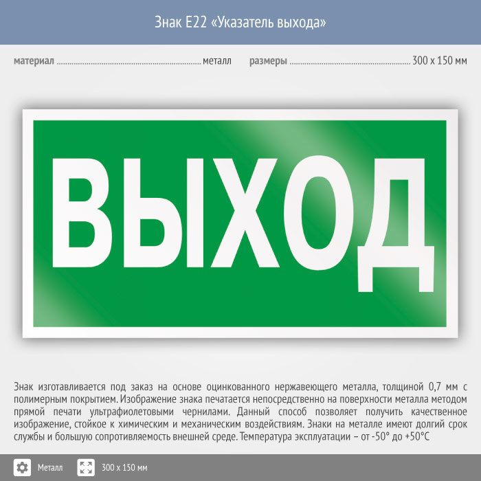 Знак E22 «Указатель выхода» (металл, 300х150 мм) в Альметьевске купить