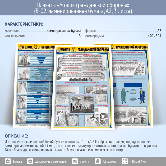 Плакаты «Уголок гражданской обороны» (В-02, ламинированная бумага, А2, 3 листа) в Альметьевске купить