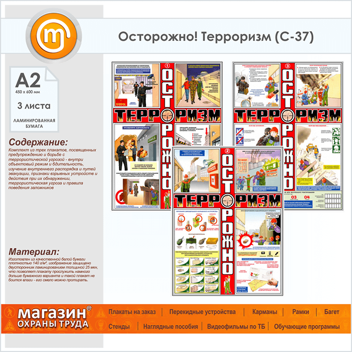 Плакаты «Осторожно! Терроризм» (С-37, ламинированная бумага, А2, 3 листа) в Альметьевске купить