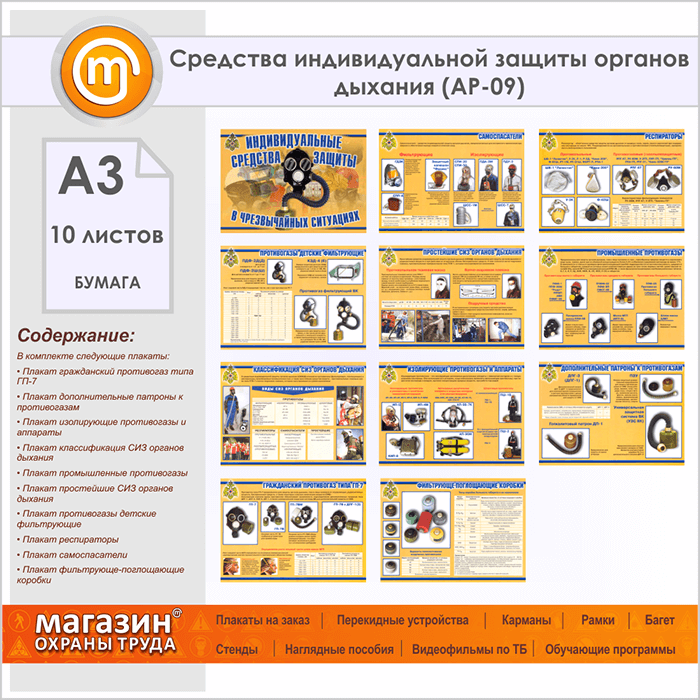 Плакаты «Средства индивидуальной защиты органов дыхания» (АР-09, бумага, А3, 10 листов) в Альметьевске купить