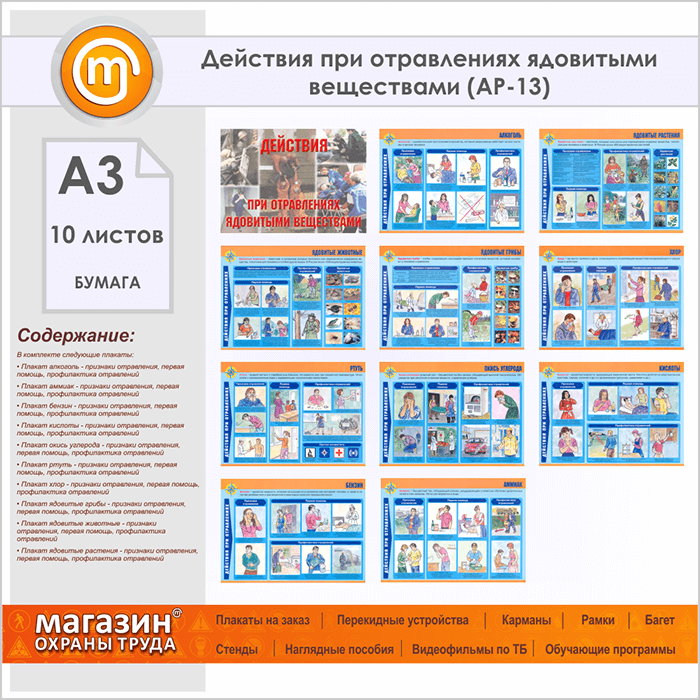 Плакаты «Действия при отравлениях ядовитыми веществами» (АР-13, бумага, А3, 10 листов) в Альметьевске купить