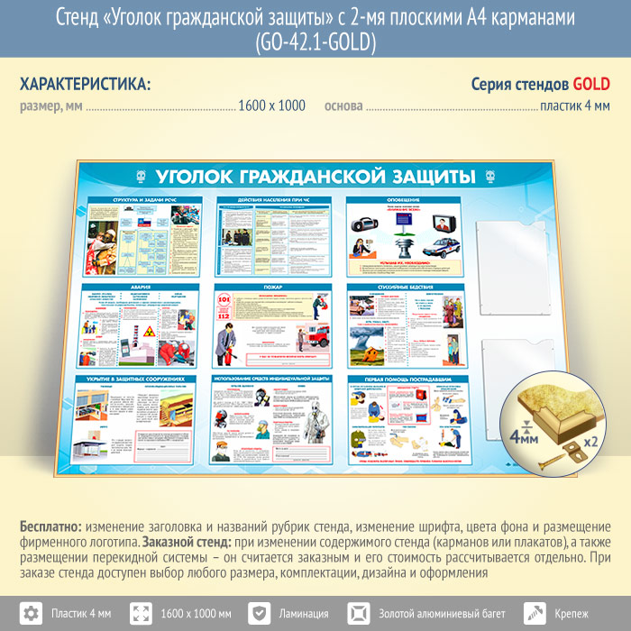 Стенд «Уголок гражданской защиты» с 2-мя плоскими А4 карманами (GO-42.1-GOLD) в Альметьевске купить