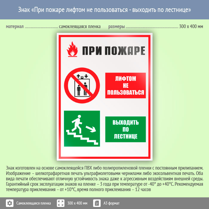 Знак «При пожаре лифтом не пользоваться - выходить по лестнице», КЗ-73 (пленка, 300х400 мм) в Альметьевске купить