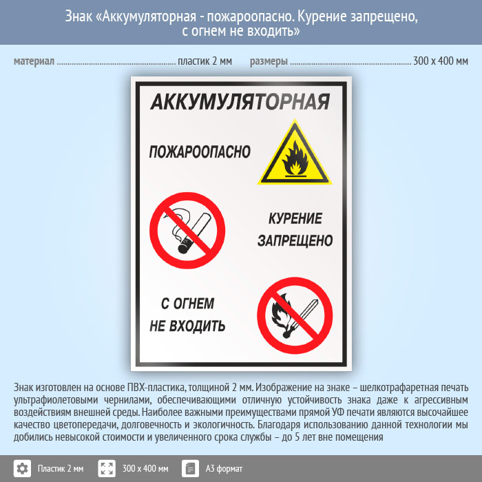 Знак «Аккумуляторная - пожароопасно. Курение запрещено, с огнем не входить», КЗ-01 (пластик, 300х400 мм) в Альметьевске купить