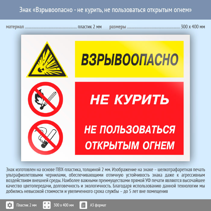 Знак «Взрывоопасно - не курить, не пользоваться открытым огнем», КЗ-05 (пластик, 400х300 мм) в Альметьевске купить