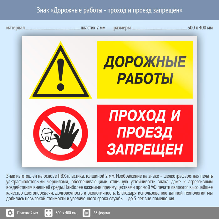 Знак «Дорожные работы - проход и проезд запрещен», КЗ-20 (пластик, 400х300 мм) в Альметьевске купить