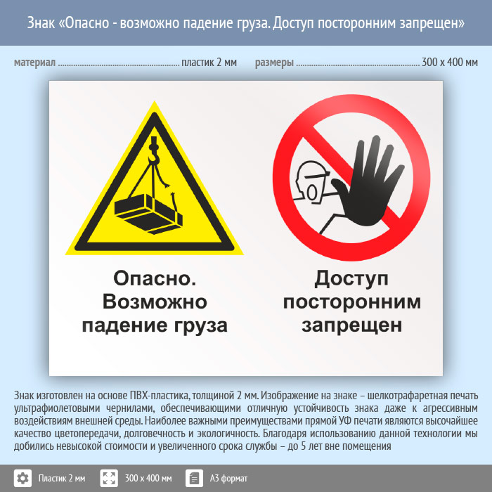 Знак «Опасно - возможно падение груза. Доступ посторонним запрещен», КЗ-33 (пластик, 400х300 мм) в Альметьевске купить