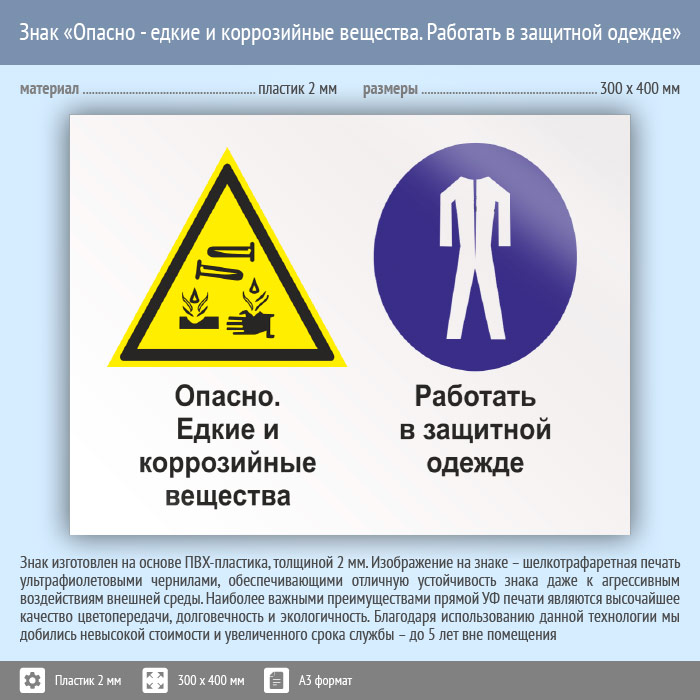 Знак «Опасно - едкие и коррозийные вещества. Работать в защитной одежде», КЗ-35 (пластик, 400х300 мм) в Альметьевске купить