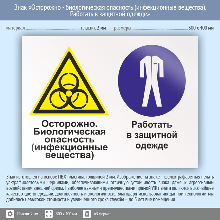 Знак «Осторожно - биологическая опасность (инфекционные вещества). Работать в защитной одежде», КЗ-53 (пластик, 400х300 мм) в Альметьевске купить