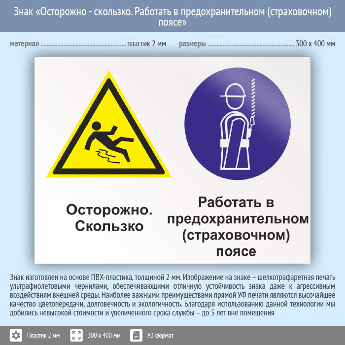 Знак «Осторожно - скользко. Работать в предохранительном (страховочном) поясе», КЗ-58 (пластик, 400х300 мм) в Альметьевске купить