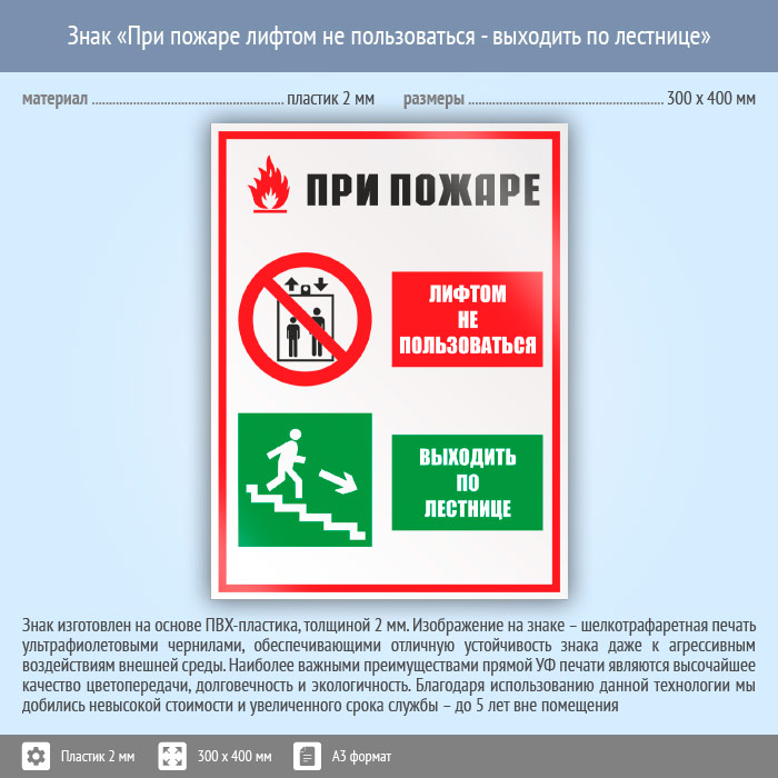 Знак «При пожаре лифтом не пользоваться - выходить по лестнице», КЗ-73 (пластик, 300х400 мм) в Альметьевске купить