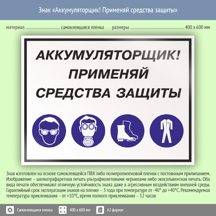 Знак «Аккумуляторщик! Применяй средства защиты», КЗ-02 (пленка, 600х400 мм) в Альметьевске купить