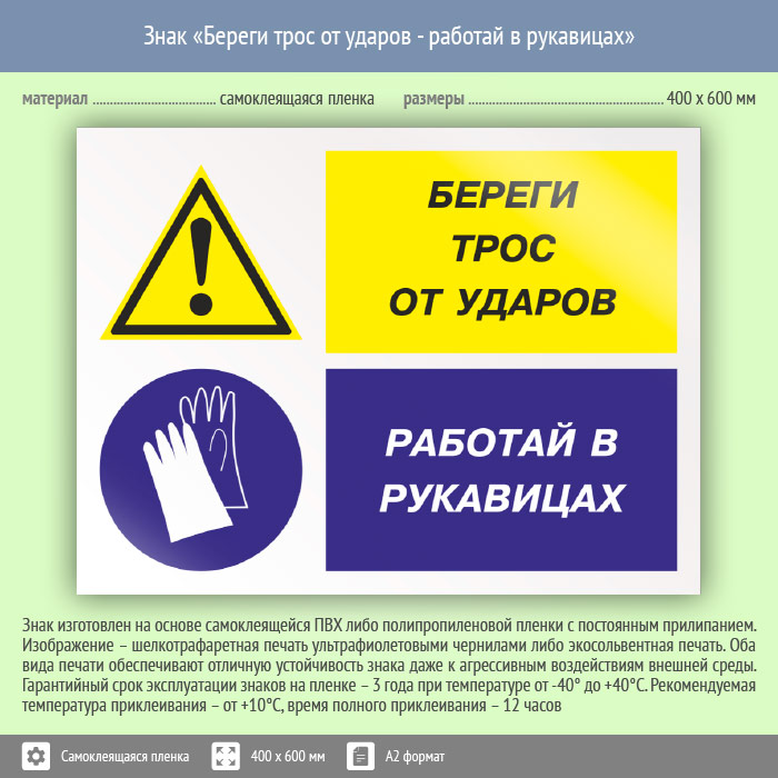 Знак «Береги трос от ударов - работай в рукавицах», КЗ-03 (пленка, 600х400 мм) в Альметьевске купить