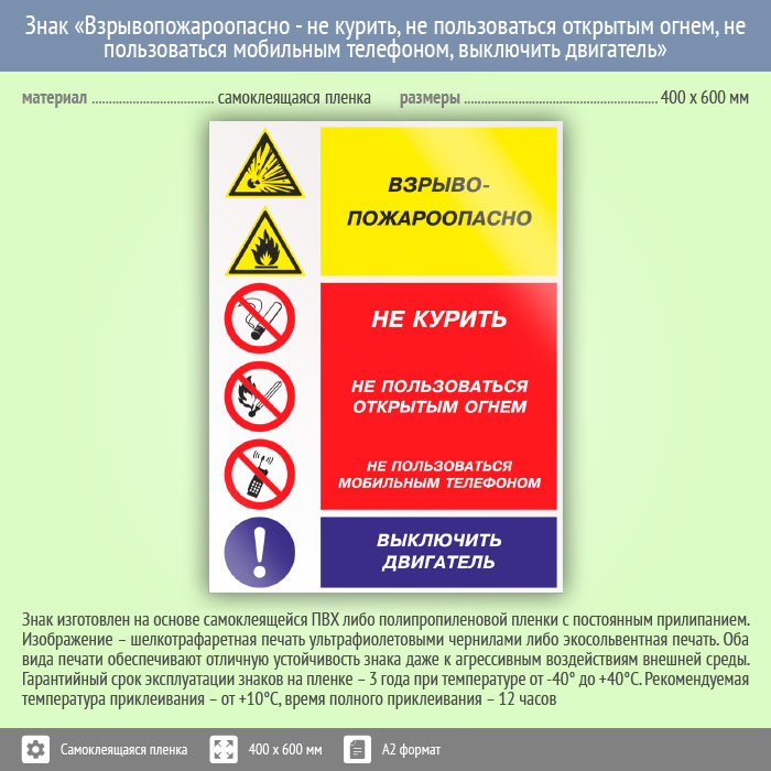 Знак «Взрывопожароопасно - не курить, не пользоваться открытым огнем, не пользоваться мобильным телефоном, выключить двигатель», КЗ-11 (пленка, 400х600 мм) в Альметьевске купить