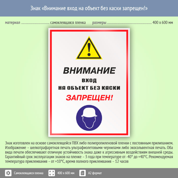 Знак «Внимание вход на объект без каски запрещен!», КЗ-13 (пленка, 400х600 мм) в Альметьевске купить