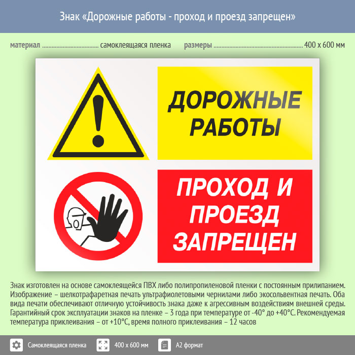 Знак «Дорожные работы - проход и проезд запрещен», КЗ-20 (пленка, 600х400 мм) в Альметьевске купить