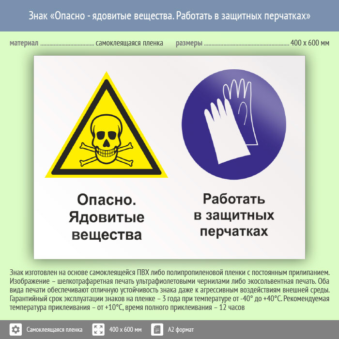Знак «Опасно - ядовитые вещества. Работать в защитных перчатках», КЗ-43 (пленка, 600х400 мм) в Альметьевске купить