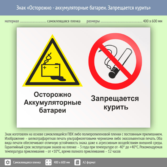 Знак «Осторожно - аккумуляторные батареи. Запрещается курить», КЗ-49 (пленка, 600х400 мм) в Альметьевске купить