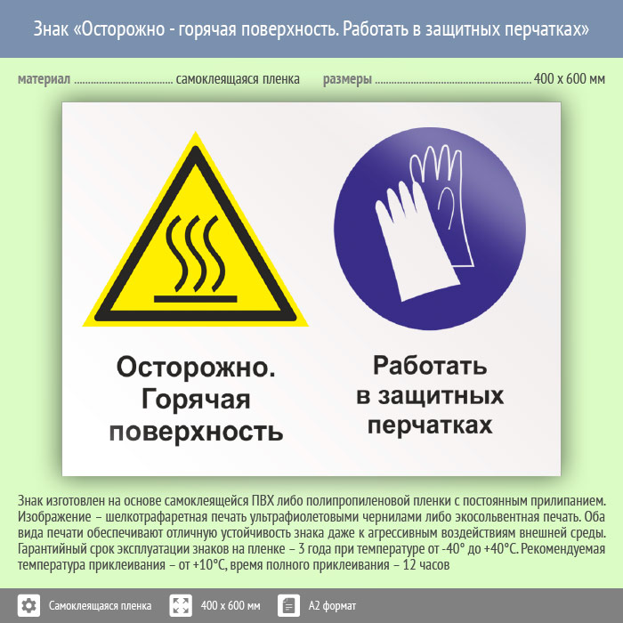 Знак «Осторожно - горячая поверхность. Работать в защитных перчатках», КЗ-55 (пленка, 600х400 мм) в Альметьевске купить
