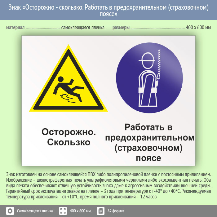 Знак «Осторожно - скользко. Работать в предохранительном (страховочном) поясе», КЗ-58 (пленка, 600х400 мм) в Альметьевске купить
